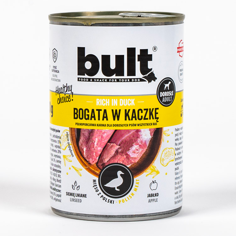 Еда без суеты? Качественные ингредиенты? Натуральная и здоровая пища? Польский продукт? У Bult есть ответ на все ваши вопросы. Консервированный корм с уткой – полезный и полноценный корм для собак. Мы консервировали лучшие кусочки. Высокое содержание мяса делает этот корм питательным и вкусным. В составе нет искусственных добавок, химикатов и консервантов. Этот корм с уткой предназначен для собак, достигших зрелости. Мы рекомендуем его всем собакам, независимо от размера и породы. Мягкая текстура и вкус усиливают удовольствие от кормления. Упаковка: 400 г