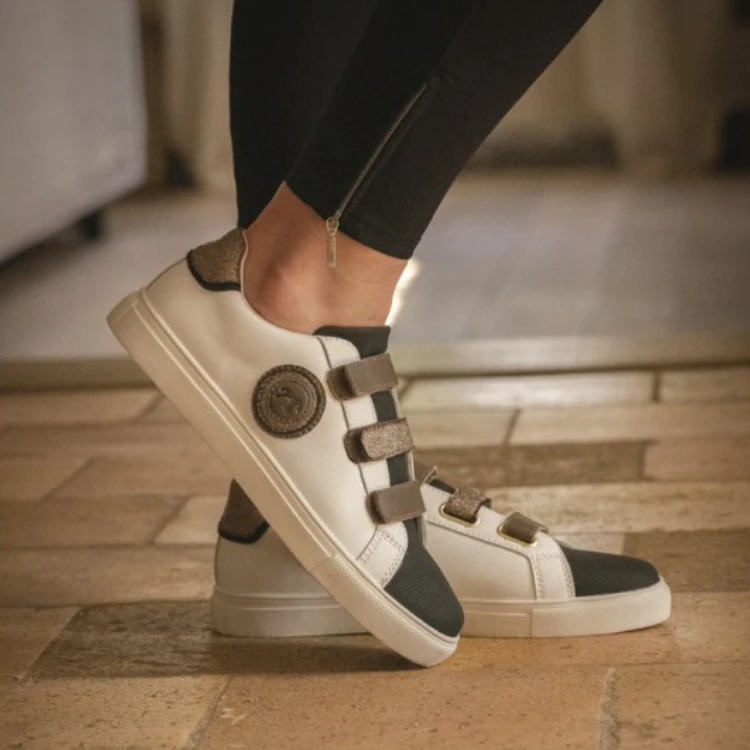 Пара кроссовок, состоящая из трех ремешков на липучке в верхней части обуви: двух ремешков из серо-коричневой кожи и центрального блестящего ремешка на липучке.