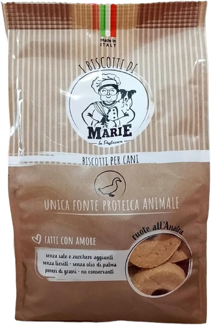 Описание продукта: Печенье Marie’s – это вкусное и питательное лакомство, специально разработанное для вашего верного четвероногого друга. Изготовленное из отборных ингредиентов, это печенье обладает непревзойденным вкусом, который порадует любую собаку. Идеально подходит в качестве поощрения или ежедневного лакомства, это полезное и вкусное лакомство для поддержания мотивации и счастья вашей собаки. Подходит для щенков и собак всех размеров. Состав: вяленая утка 26%, кукурузная мука 25%, пшеничная мука (мягкая пшеница типа «0») 25%, рафинированные растительные масла 5%. Способ применения: Всегда контролируйте собаку во время еды. Подробнее