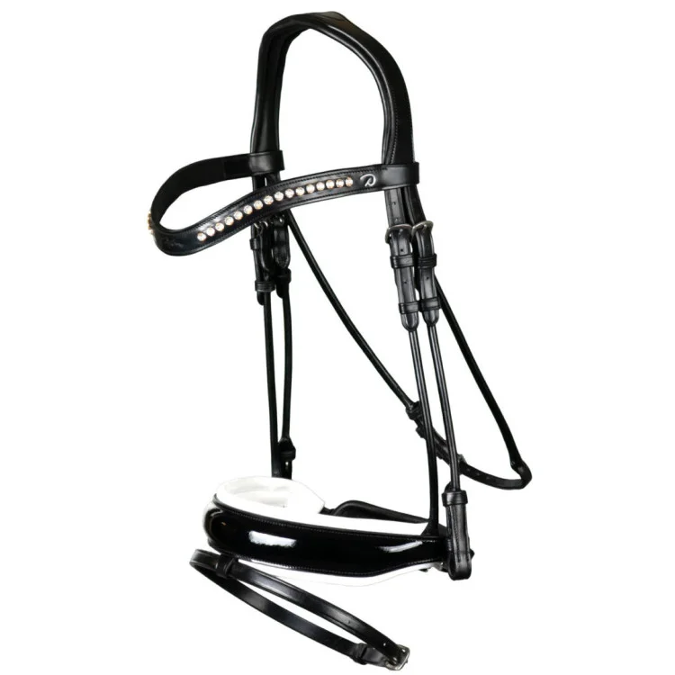 Эту очень красивую выездковую уздечку отличает V-образная налобница, украшенная кристаллами Свароски.