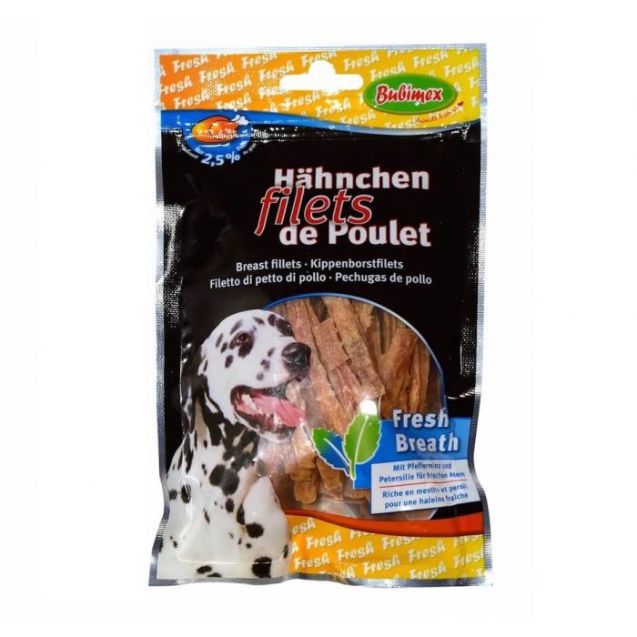 Fresh Breath от Bubimex — это куриное филе, тщательно отобранное и высушенное для сохранения вкусовых качеств. Эти лакомства обогащены мятой, петрушкой и эвкалиптом, чтобы освежить дыхание вашего четвероногого друга.