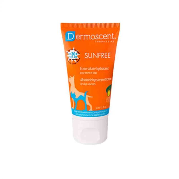 Dermoscent SunFREE для собак и кошек — это увлажняющий солнцезащитный крем SPF 30+ для хрупких участков кожи и всех типов волос. Он сертифицирован как совместимый с UVA-UVB, а его текстура водостойкая!