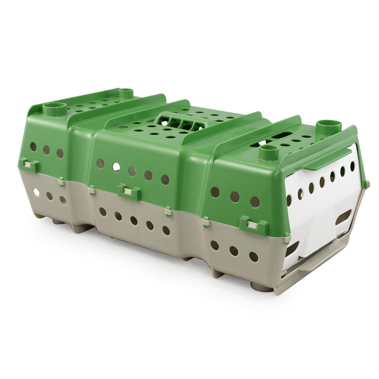 Дверцы для быстрого заполнения защелкиваются, чтобы обеспечить безопасность 5-6 пернатых дичи во время транспортировки. Компактный и легкий пластиковый ящик из прочного, устойчивого к ультрафиолетовому излучению пластика. Поставляется в трех частях и защелкивается вместе. Имеет двери для быстрого заполнения с обоих концов. Полностью собранный курятник весит 5,45 фунта.