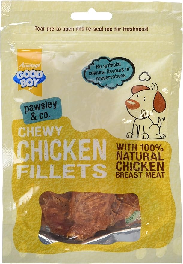 В Good Boy Wags & Co. вилять хвостом – привычное дело для вашей собаки. Мы создаём поистине восхитительные и восхитительные лакомства, которые порадуют и развлекут вашу собаку. Это нежное куриное филе приготовлено из невероятно ароматного 100% натурального куриного филе и, несомненно, станет одним из любимых лакомств вашей собаки. Эти ароматные лакомства, обжаренные в собственном соку, чтобы сохранить вкус настоящей курицы, не содержат зерна, искусственных красителей и ароматизаторов. Помимо того, что они невероятно вкусные, они ещё и полезны для здоровья, так как содержат всего 2% жира. Кроме того, их плотная текстура означает, что они отлично подходят для поддержания чистоты и здоровья зубов вашей собаки. — Подготовка и: Рекомендации по кормлению: Кормите в качестве лакомства, поощрения или для дрессировки. Всегда обеспечьте наличие ёмкости со свежей чистой водой. Рекомендуется следить за питомцами во время кормления. Лакомства следует давать на неокрашиваемых поверхностях. Не подходит для щенков младше 4 месяцев. Не подходит для употребления в пищу человеком. Этот продукт может содержать пакетик с раскислителем, который следует выбросить и не давать собаке. Пожалуйста, мойте руки после использования продукта.