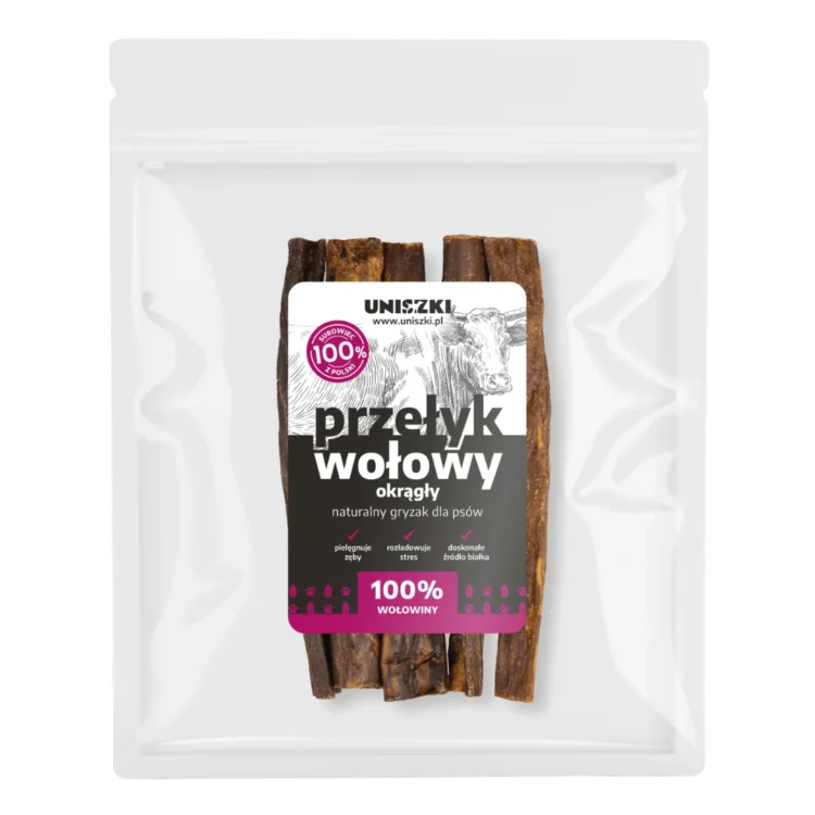 Натуральный сушеный снек от польского производителя. Говяжий пищевод эффективно снимает стресс у собак – он довольно плотный, идеально подходит для жевания и пережевывания. Он также является отличным источником белка, который способствует обновлению эпидермиса, росту когтей и здоровому обмену веществ. Эта жевательная резинка помогает удалить зубной камень. Давая своему четвероногому другу это лакомство, вы помогаете ему поддерживать здоровье зубов. Чтобы говяжий пищевод оставался свежим, храните его в сухом месте при комнатной температуре. Не забудьте плотно закрыть упаковку. Размер: 100 г.