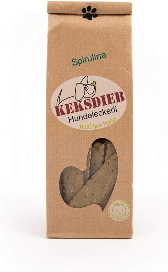 Упаковка из двух печенек Spirulina Cookie Thief, пищевая, произведена на качественном заводе в Германии. Здоровое вегетарианское лакомство для перекуса или в качестве поощрения для вашей собаки. Полезное и хрустящее, вкусное и веселое лакомство для вашей собаки. Состав: мука из спельты (тип 1050), овёс высшего качества, сыр пармезан, спирулина. Состав: сырой протеин 13,5%, сырая клетчатка 3,7%, зола 1,4%.