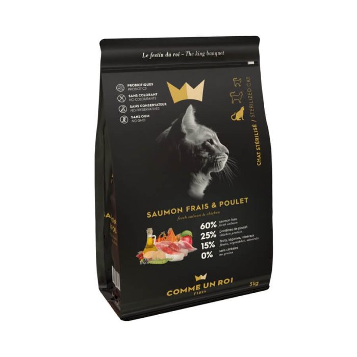 Не содержащие злаков кусочки лосося и курицы Comme un Roi богаты белком, чтобы обеспечить вашей стерилизованной кошке здоровое и сбалансированное питание. Кошачьи крошки.