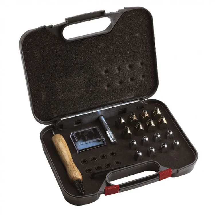 Этот чемодан состоит из 8 кошек-ракушек на высоте 19 мм над утюгом, 8 закругленных кошек на высоте 12 мм над утюгом, 8 защитных навинчивающихся колпачков с резьбой 10 x 150, 10 резиновых врезных заглушек, 1 шестигранного ключа 5, 1 Т-образного ключа 10. х 150, 1 врезная кисть, нитки 10 х 150.