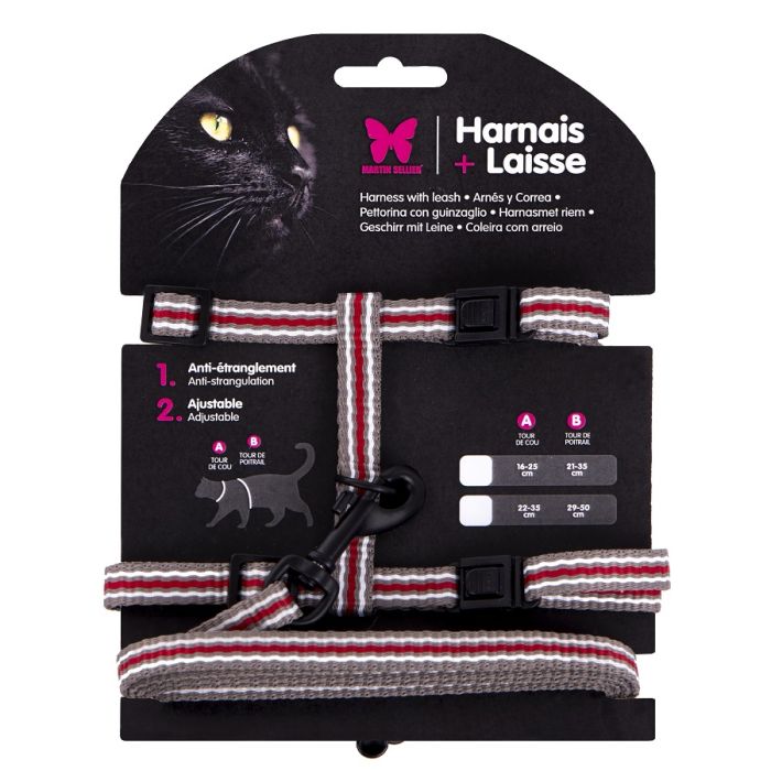 Комплект шлейки и поводка Martin Sellier был специально разработан для кошек. Трехцветные полосы: серый, белый и красный будут отлично смотреться на пушистом шаре. Для безопасных прогулок на свежем воздухе.