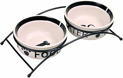 Информация о товаре: Очень привлекательный набор из 2 керамических мисок с подставкой. Металлическая подставка с черным порошковым покрытием. Нескользящая поверхность благодаря резиновым ножкам. Миски можно мыть в посудомоечной машине. › Подробнее о товаре