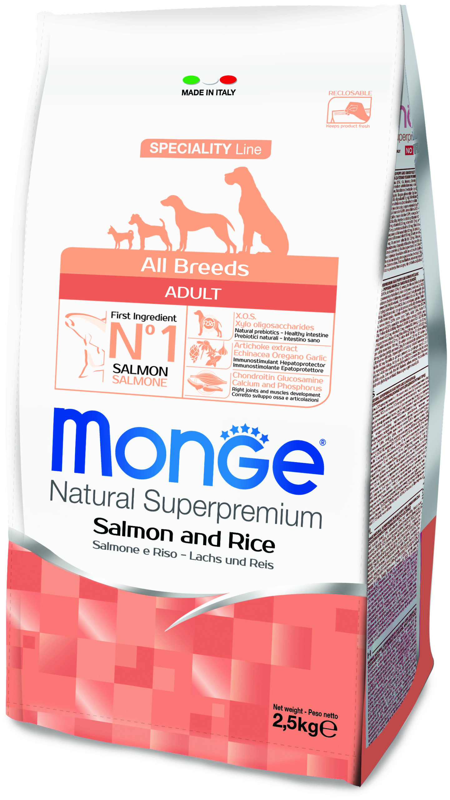 Корм для взрослых собак с лососем и рисом — полноценный корм для всех пород.