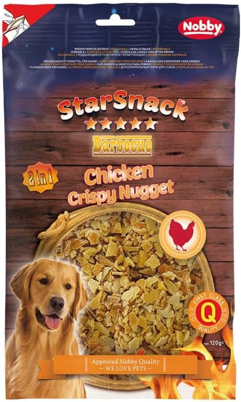 Описание StarSnack BBQ Chicken Crispy Nuggets — это исключительно натуральное лакомство. Они изготовлены из 61,7% нежирного куриного мяса и 16% говяжьей кожи. Содержание жира составляет 3,5%. Здоровый перекус для вашей собаки в любое время. Они поставляются в закрывающемся пакете, чтобы сохранить их свежими в течение длительного времени. Инструкция по применению: кормить в качестве поощрения или в любое время как часть сбалансированного питания. Хранить в прохладном, сухом месте. Всегда обеспечивать достаточное количество свежей воды. Не подходит для употребления в пищу человеком. Ингредиенты: Дополнительный корм для собак. Состав: Курица 61,7%, сырая кожа 16%, глицерин, кукурузный крахмал 7,7%, растительный белок. Аналитические компоненты: Сырой протеин 42%, влажность 20%, содержание жира 3,5%, сырая зола 2,5%, сырая клетчатка 1,0%. Рекомендации по кормлению: В качестве поощрения или в любое время как часть сбалансированного питания. Кормить в качестве лакомства. Хранить в прохладном, сухом месте. Всегда обеспечивать достаточное количество свежей воды. Не подходит для употребления в пищу человеком. Инструкция по применению: давать в качестве лакомства или в любое время в составе сбалансированного рациона. Хранить в прохладном, сухом месте. Всегда обеспечивать достаточным количеством свежей воды. Не подходит для употребления в пищу человеком. Подробнее