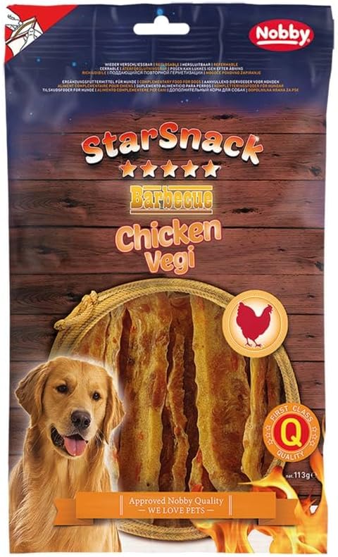 Описание: StarSnack BBQ Chicken Vegi — это исключительно натуральное лакомство. Содержит 74,8% нежирного куриного мяса и 3% жира. Полезный перекус для вашей собаки в любое время. Корм поставляется в герметично закрывающемся пакете для длительного сохранения свежести. Ингредиенты: «Дополнительный корм для собак. Состав: курица 74,8%, глицерин, растительный белок, кукурузный крахмал 5%, овощи. Аналитические компоненты: сырой протеин 47%, влажность 16%, сырая зола 4,0%, жир 3,0%, сырая клетчатка 1,0%. Рекомендации по кормлению: в качестве поощрения или в любое время в рамках сбалансированного питания. Хранить в прохладном, сухом месте. Всегда обеспечивать достаточное количество свежей воды. Не подходит для употребления в пищу человеком». Инструкция по применению: давать в качестве поощрения или в любое время в рамках сбалансированного питания. Хранить в прохладном, сухом месте. Всегда обеспечивать достаточное количество свежей воды. Не подходит для употребления в пищу человеком. Подробнее