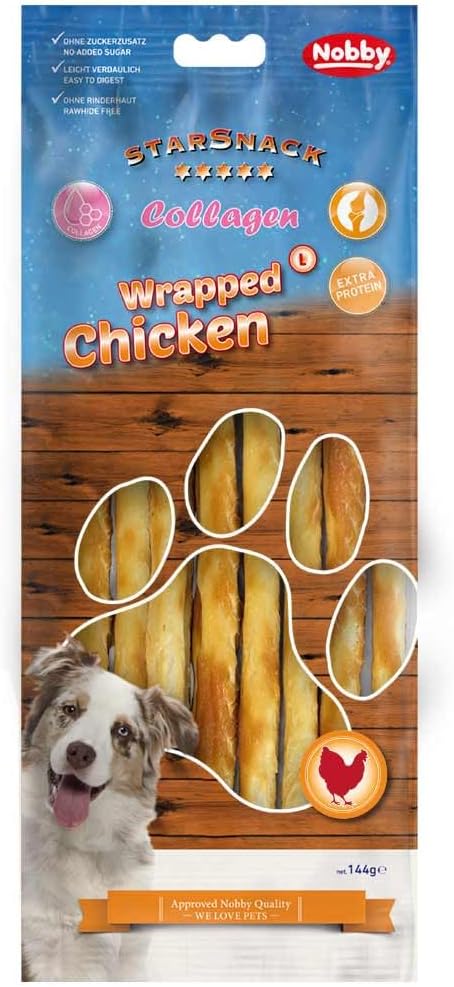Описание 144-граммовый пакет StarSnack Barbecue Wrapped Chicken Collagen L содержит 60% коллагена (говядины), 36,4% курицы, 4% жира и не содержит шкуры. Лакомства изготовлены из натурального сырья и имеют высокое содержание белка. Ингредиенты: 60% говяжьего коллагена, 36,4% курицы, растительные субпродукты, экстракты растительного белка (0,5% арахисового белка, 0,4% горохового белка), минералы. Инструкция по применению: Откройте для себя StarSnack Chicken Treats Collagen — идеальную награду для вашей собаки! Эти восхитительные лакомства изготовлены из высококачественного коллагена, который поддерживает суставы и соединительные ткани вашего четвероногого друга, и обернуты в сочную курицу. Благодаря высокому содержанию белка они обеспечивают ценные питательные вещества, которые поддерживают вашу собаку в форме и активны. Наши лакомства не содержат шкуры и добавленного сахара, что делает их особенно полезными и легкоусвояемыми. Благодаря натуральным ингредиентам они отлично принимаются собаками всех пород и размеров. Порадуйте свою собаку вкусным и полезным лакомством — куриными лакомствами StarSnack Collagen! Смотреть ещё
