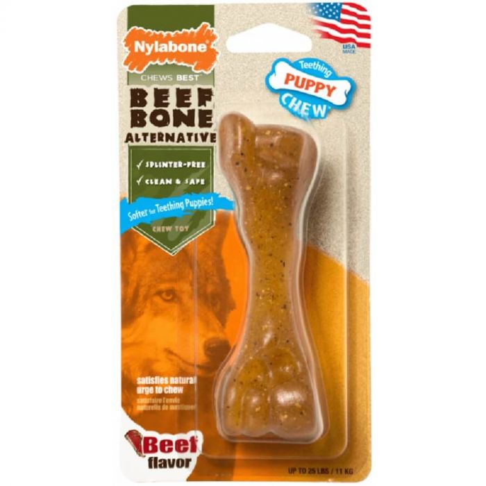 Nylabone Puppy Teething Chew Alternative Beef Bone — отличная альтернатива настоящим костям: чище, безопаснее и без осколков. Эта игрушка ароматизирована, чтобы стимулировать жевание, отлично подходит для развлечения вашей собаки, для ухода за зубами и уменьшения разрушительного жевания. Для мягкого жевания.