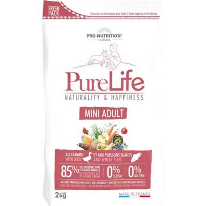 PureLife Mini Adult — сбалансированный и полноценный корм для собак мелких пород. Это диета из утки и белой рыбы, содержащая 85% белка животного происхождения, рецепт без злаков и глютена.