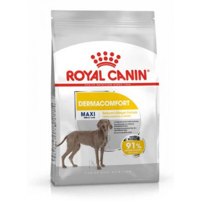 Royal Canin Maxi Dermacomfort ? полное питание для взрослых собак и зрелых крупных пород (от 26 до 44 кг) при условии раздражение кожи и зуд. От 15 месяцев и старше.Maxi Dermacomfort ?© формулы, уменьшается на аллергены (белки ??????выбор высокого качества ). С эксклюзивный комплекс питательных веществ для укрепления барьера кожи, в сочетании с жирными кислотами омега 6 (включая гамма-линоленовой кислоты), омега 3 (включая EPA и DHA), известные для их благотворное воздействие на кожу.