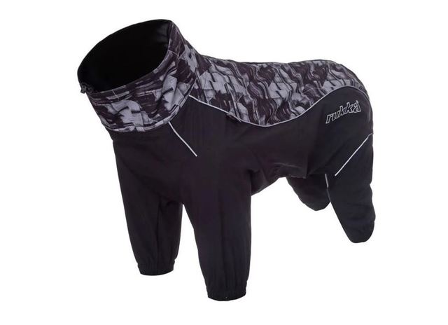 Кормовое пальто на холодные ветреные дни. Комбинезон водонепроницаемый и теплый. В целом упругой материал не мешает активному движению собаки. На спине замок закреплен, а отверстие для прикрепления поводка под курткой. С высоким воротником.