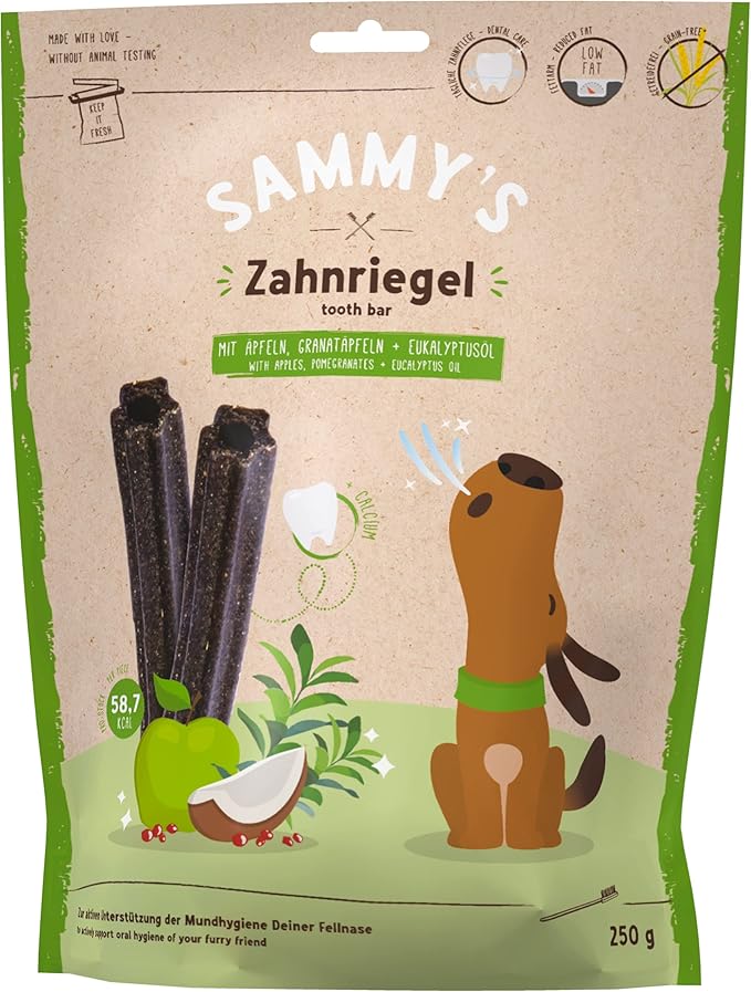 С яблоками, гранатом и маслом эвкалипта: для активной поддержки гигиены полости рта вашего пушистого носа Вкусные функциональные закуски от Sammy’s как идеальное дополнение к ежедневному любимому корму вашей собаки Без добавления сахара, химических красителей и ароматизаторов Для взрослых собак от 12 месяцев Сделано с любовью в Бад-Вюртемберге ›