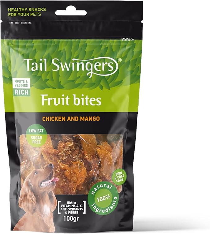 Описание продукта: Снэки TAILSWINGERS с манго и курицей, на 100% богатые витаминами A, C и антиоксидантами, идеально подходят в качестве поощрения для вашего четвероногого друга, на 100% без зерна и глютена. Купите 4 снэка по 100 грамм каждый по выгодной цене. Состав: 49,8% куриного филе, 45% манго.