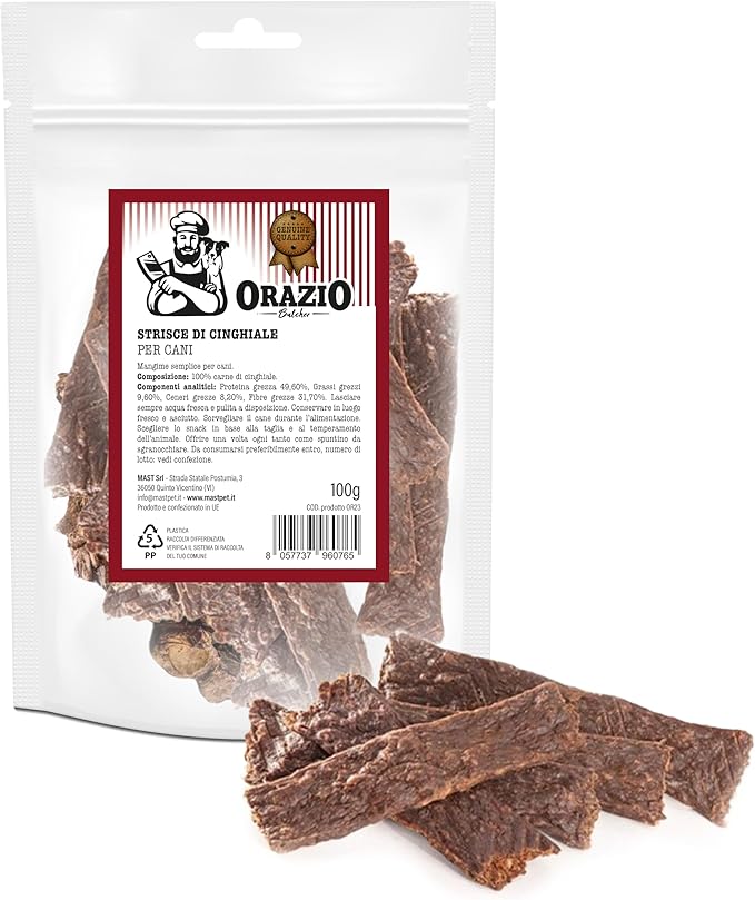 Описание продукта: Сушеные полоски из мяса дикого кабана — это 100% натуральный перекус и корм, богатый высококачественным белком. Жевание необходимо собакам, поскольку оно стимулирует выработку серотонина и дофамина, которые полезны для психического здоровья и хорошего самочувствия. Выработка слюны помогает устранить бактерии, которые могут образовываться во рту: полоски уменьшают образование зубного налета и зубного камня, делая их полезным лакомством. Они богаты белком и содержат мало жира. Отличный перекус для собак, страдающих аллергией. Полоски из мяса дикого кабана подходят для собак с чувствительным желудком, проблемами пищеварения или аллергией. Высушиваются на воздухе для сохранения всех питательных веществ. Идеально подходит для собак всех размеров: в качестве перекуса между основными приемами пищи, в качестве поощрения во время дрессировки или в качестве лакомства. Состав: 100% мясо дикого кабана. Показания: подходит для собак всех размеров и возрастов. Подробнее