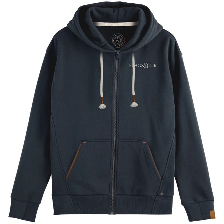На передней части толстовки гордо изображен принт FLAGS&CUP в центре, а логотип F&C, вышитый на кожаной нашивке, украшает капюшон, добавляя отличительный знак и отпечаток элегантности этому повседневному предмету одежды.