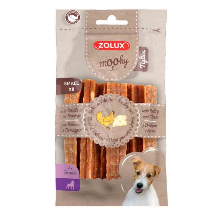 Zolux Mooky Premium Tiglies Poultry Cheese — это вкусные лакомства, богатые мясом птицы, чтобы вознаградить вашу собаку.