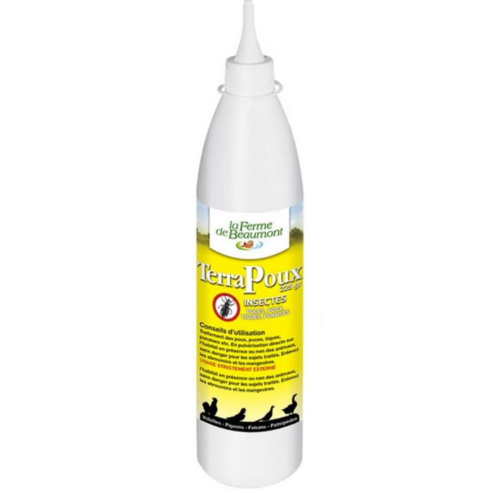 Terrapoux — натуральный инсектицидный порошок на основе диатомовой земли. Очень эффективен против ползающих насекомых, таких как красные клещи, блохи, клещи, постельные клопы, тараканы, чешуйницы. Можно использовать как для защиты домашней птицы, так и для домашних животных или для обработки дома.