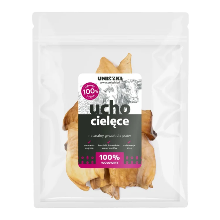 Телячье ухо – интересное и ценное дополнение к рациону собаки, в котором часто преобладают говядина и птица. Натуральное жевательное мясо теленка обеспечит вашей собаке часы удовольствия и одновременно обогатит её ежедневный рацион ценными микро- и макронутриентами. Телячье ухо – это полноценное жевательное лакомство. Это означает, что оно не только развлекает вашу собаку, но и способствует её умственному развитию. Это настоящее лакомство для вашего питомца и источник ценных питательных веществ. Узнайте о всех преимуществах этого жевательного лакомства для здоровья вашей собаки: Для укрепления костей: телячье ухо может стать отличным источником минералов, дополняющих ежедневный рацион вашей собаки. Среди этих микроэлементов особенно важны кальций и фосфор. Оба элемента необходимы для здоровья костей, обеспечивая необходимую прочность и гибкость. Для повышения иммунитета: давайте собаке цинк. Вы можете сделать это, дополняя рацион вашего питомца жевательными лакомствами из телячьего уха. Содержащийся в нем цинк действует как кофактор – фактор, ускоряющий химические реакции, такие как выработка антител, отвечающих за эффективный иммунный ответ на инфекции. Телячье ухо также содержит витамин С – мощный антиоксидант, который помогает бороться со свободными радикалами и предотвращать повреждение клеток иммунной системы. Витамин С также способствует выработке этих клеток, также известных как лимфоциты. Для улучшения пищеварения: длительное жевание телячьего уха может стимулировать секрецию пищеварительных ферментов в пищеварительной системе собаки. Это напрямую влияет на перистальтику кишечника и способствует правильному усвоению питательных веществ из корма. Отличное вознаграждение для снятия стресса: собакам никогда не бывает скучно играть с таким лакомством, как телячье ухо. В результате продолжительная концентрация внимания вашего питомца на жевании помогает регулировать избыточное эмоциональное напряжение и энергию. Сосредоточение вашего внимания на жевании снимает беспокойство и помогает избавиться от скуки в повседневной жизни вашей собаки. Для здоровья кожи и шерсти: богатство полезных веществ и питательных веществ, содержащихся в телячьем ухе, может вас удивить. Одним из таких микроэлементов является железо, которое способствует правильному образованию эритроцитов. Эти эритроциты доставляют кислород к клеткам кожи и волосяным фолликулам, тем самым способствуя здоровому состоянию кожных тканей и шерсти вашей собаки. Еще одно ценное вещество, содержащееся в жевательных конфетах, — линолевая кислота. Этот тип жира помогает поддерживать надлежащую гидратацию кожи и предотвращает чрезмерную сухость. Что касается натурального белка: белок является основным строительным материалом для мышц, кожи, шерсти, костей и внутренних органов собаки. Поэтому его регулярное поступление так важно для поддержания и регенерации тканей. Он особенно важен для щенков и молодых собак, поскольку способствует их правильному развитию. Белок также тесно связан с другими веществами, выступая в качестве транспортера, распределяющего гормоны и питательные вещества по всему организму собаки. Для мышечной функции богатое белком телячье ухо может помочь регулировать метаболические процессы, связанные с работой