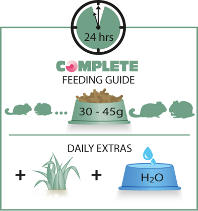 30–45 г на животное в день, в зависимости от возраста и размера. Обеспечьте постоянный доступ к свежей воде.