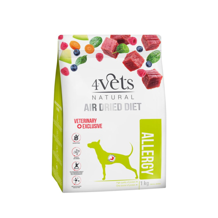4Vets Natural Allergy — это полноценный диетический сухой корм для собак с пищевой непереносимостью или аллергией. Он содержит один источник белка и повышенное содержание жирных кислот Омега-3 и Омега-6, которые уменьшают воспаление и смягчают раздражение как желудочно-кишечного тракта, так и кожи. Эта ветеринарная диета облегчает симптомы диареи, связанные с пищевой непереносимостью. Преимущества: Содержит сухие пивные дрожжи (источник пребиотиков: маннанолигосахаридов и β-глюканов), которые поддерживают иммунную систему, улучшают пищеварение и способствуют здоровому стулу. Они являются ценным источником легкоусвояемых витаминов и минералов, увеличивая их содержание в корме. Беззерновой — корм содержит картофельный и гороховый крахмал, что гарантирует отсутствие зерновых и белков, которые могут вызывать аллергические реакции. Рецептура основана на мясе и продуктах животного происхождения, а также разнообразится овощами и фруктами. Содержит один источник животного белка (монопротеиновый корм) – в данном случае говядину, которая, помимо белка, также обеспечивает высокий уровень незаменимых аминокислот и высокий коэффициент усвояемости. Использование одного источника белка исключает потенциальные факторы, провоцирующие аллергические реакции или пищевую непереносимость. Содержит жирные кислоты Омега-3 и Омега-6 – высокое содержание полиненасыщенных кислот, полученных из льняного масла и лосося в оптимальных пропорциях, помогает контролировать воспаление кожи и симптомы аллергии. Содержит морские водоросли – они являются источником ценных биологически активных соединений и легкоусвояемых минералов и витаминов, витаминов (например, β-каротина) и минералов (включая калий, фосфор, магний, кальций, натрий, хлор, серу, йод и железо). На продукте может появиться белый налет, являющийся результатом естественной кристаллизации мясных компонентов. Это не влияет на качество продукта. Упаковка: 1 кг