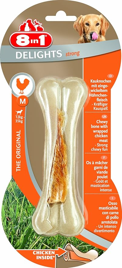 8in1 Delights Chicken — Osso da masticare Strong taglia M (per cani di taglia media extra forte, da 12 a 35 kg, carne di pollo di alta qualità avvolta nella pelle bovina), 1 pezzo