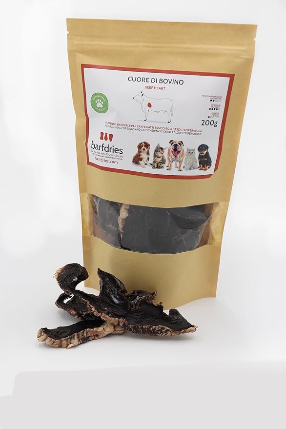 Состав: 100% говяжье сердце — Вес 200 г — Этот продукт термически обработан и высушен при низких температурах (пастеризация). Без солей, консервантов и усилителей вкуса. Говяжье сердце — исключительный вариант для любителей мяса, состоящий из жестких мышечных волокон, обогащенных кусочками затвердевшего жира, которые делают его невероятно вкусным. Это мясо отличается не только своим вкусом, но и своей питательной ценностью. Оно богато высококачественным белком и обеспечивает исключительно высокий профиль аминокислот. Это делает его отличным выбором для тех, кто ищет постный, полноценный источник белка. Кроме того, это отличный источник биодоступного таурина. Таурин — незаменимая аминокислота, которая играет решающую роль в организме. Он необходим для выработки желчи, которая, в свою очередь, необходима для переваривания жиров и жирорастворимых витаминов. Наличие таурина в говяжьем сердце делает его полезным продуктом для здоровья печени и процесса пищеварения. Его вкусовые качества очень высоки благодаря насыщенному вкусу и сочетанию мышечной клетчатки и жира, что делает его привлекательным для домашних животных. Однако его относительно лёгкая рассыпчатость делает его отличным жевательным упражнением, способствуя здоровью зубов вашей собаки. Если вы ищете источник постного белка, незаменимого таурина и исключительного вкуса, чтобы побаловать своего четвероногого друга, говяжье сердце — отличный выбор. Бренд BARFDRIES — надёжный выбор, предлагающий высококачественные корма для домашних животных. Порадуйте их вкусным и питательным кормом. › Подробнее о продукте