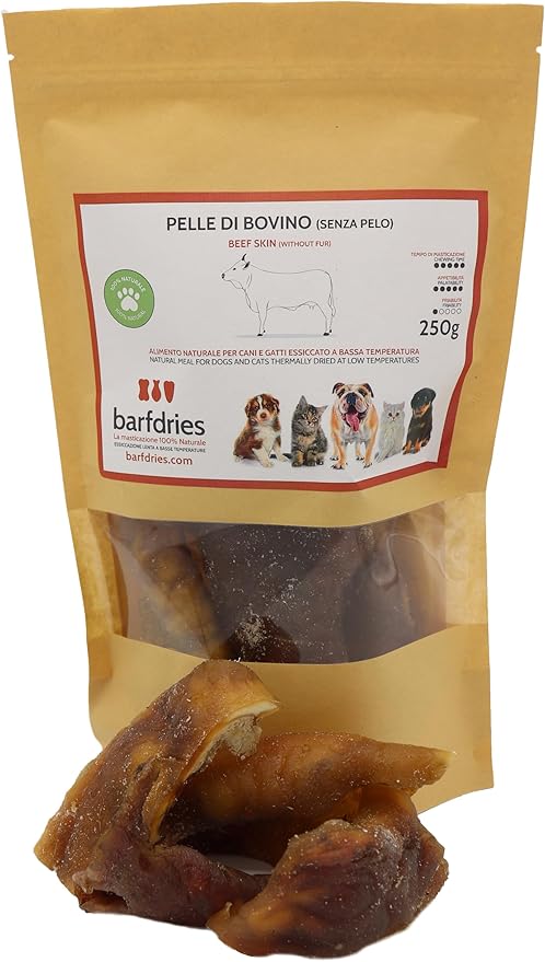 barfdries Pelle di Bovino senza pelo, alimento naturale per Cani e Gatti essicato a bassa temperatura. Confezione da 250 gr