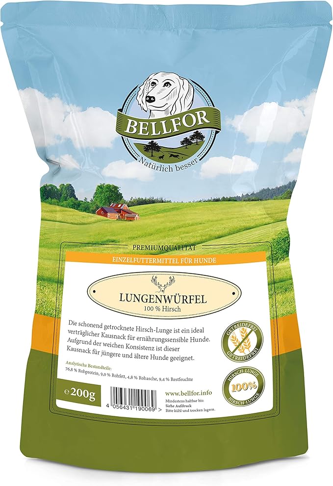 Натуральные жевательные лакомства для собак: кубики из оленьих лёгких Bellfor дарят вашей собаке удовольствие от жевания, которое способствует здоровью зубов и уменьшает скуку. Они идеально подходят для поощрения между кормлениями. Гипоаллергенные: эти лакомства особенно подходят для собак с пищевой непереносимостью. Изготовленные из 100% оленины, они не содержат злаков, глютена и искусственных добавок. Мягкая текстура для всех собак: благодаря своей мягкой текстуре кубики из оленьих лёгких идеально подходят не только для взрослых собак, но и для щенков и пожилых собак. Их легко жевать, и они не повреждают зубы и десны. Натуральные и местные: кубики из оленьих лёгких Bellfor изготовлены из 100% оленьих лёгких местного происхождения и не содержат искусственных красителей, ароматизаторов и консервантов. Универсальные и вкусные: эти лакомства не только очень вкусные, но и легкоусвояемые. Они идеально подходят в качестве поощрения во время дрессировки и прогулок, а также обеспечивают вашей собаке необходимое количество белка. › Подробнее о товаре