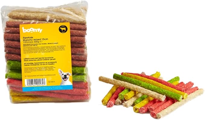 Об этом товаре. Вкусная коровья кожа: изготовлена из высококачественных ингредиентов с натуральным вкусом, который так нравится собакам. Удобная упаковка: упакована в пакет по 100 штук, идеально подходит для регулярного балования вашей собаки. Длительное удовольствие от жевания: прессованная коровья кожа гарантирует, что ваша собака сможет жевать и наслаждаться лакомством дольше. Уход за зубами: жевательные палочки Munchy помогают уменьшить зубной налет и зубной камень, что полезно для зубов вашей собаки. Полезно и питательно: нежирный перекус, который способствует здоровому образу жизни вашей собаки. › Подробнее о товаре