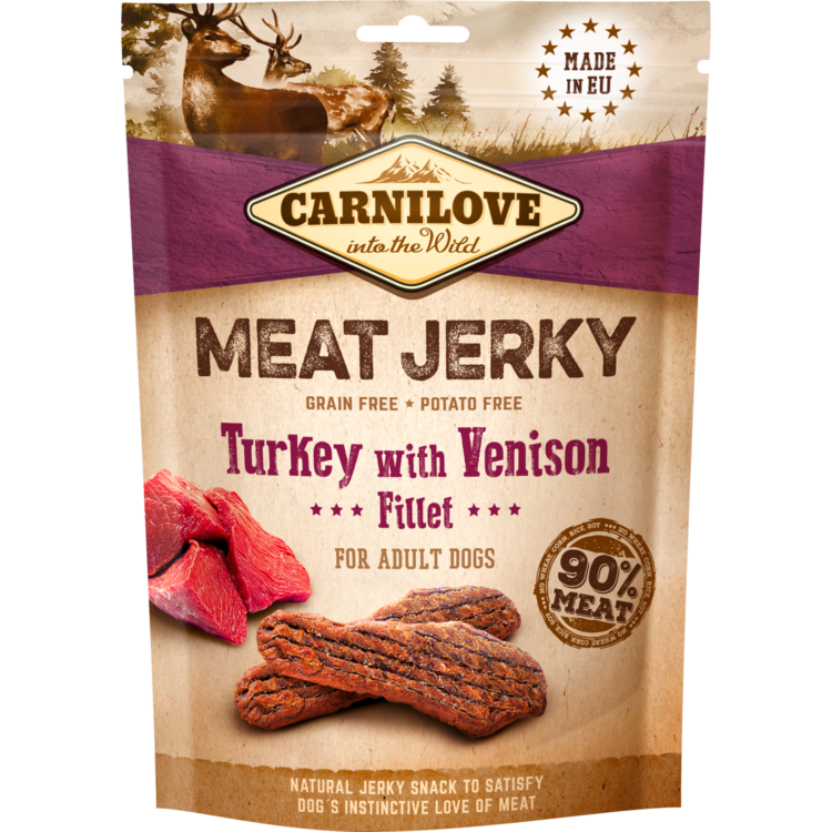 Carnilove ВЯЛЕНОЕ МЯСО ИНДЕЙКИ С ФИЛЕ ОЛЕНИНЫ 100 Г – лакомство для собак из вяленого филе индейки и оленины. Высококачественные, полезные и невероятно вкусные снеки в виде вяленого филе. Они являются ценной пищевой добавкой и отличной мотивацией во время дрессировки. Отлично подходят в качестве поощрения. Содержат 90% мяса индейки и оленины и только натуральные антиоксиданты. Лакомство не содержит зерна, картофеля, красителей, сахара и ГМО. Упаковка завязывается на веревочке для длительного сохранения свежести продукта.