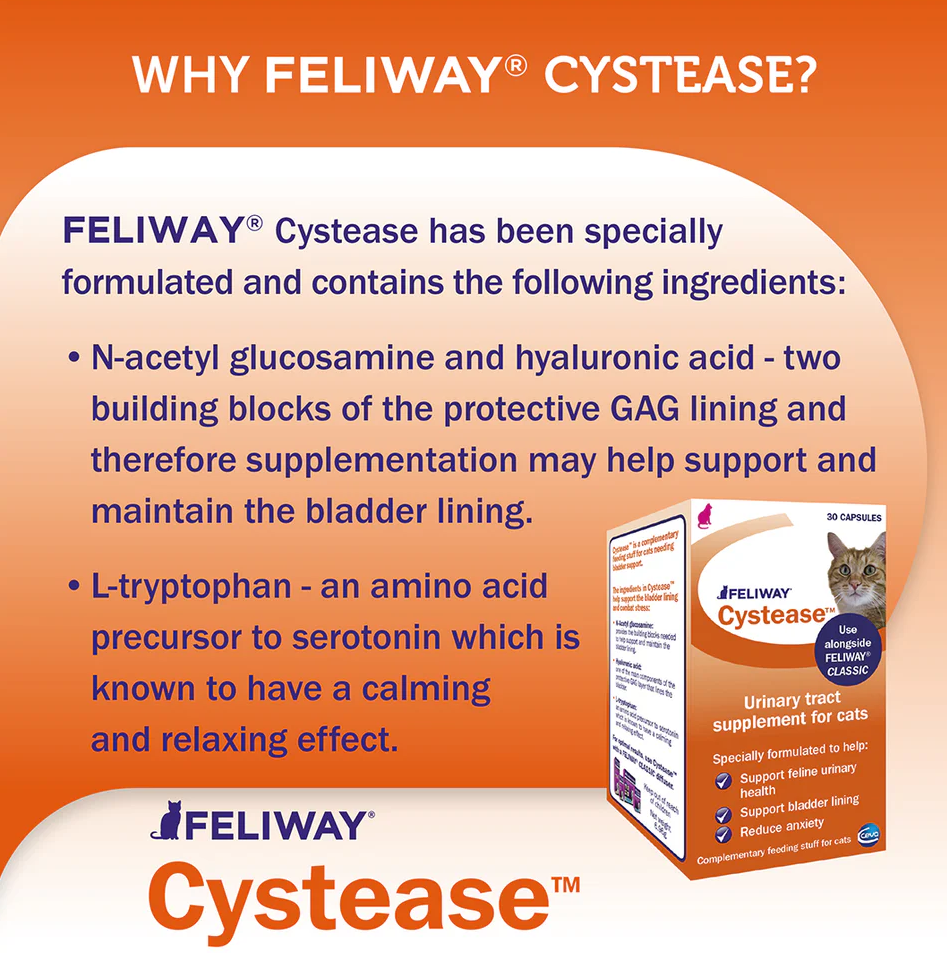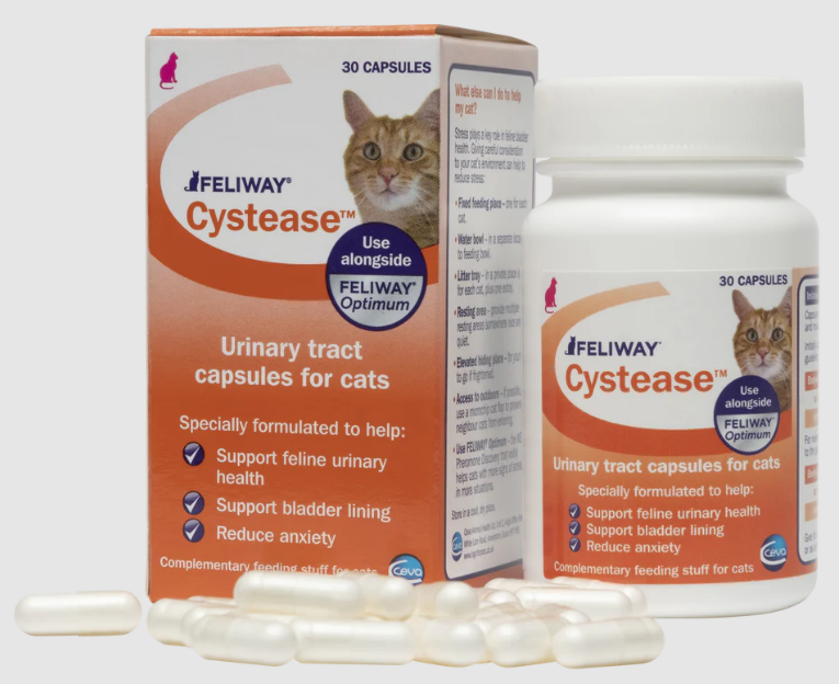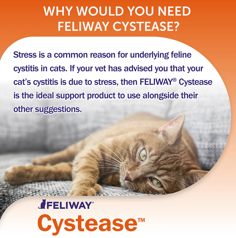 Feliway Cystease — это специально разработанная оральная добавка, предназначенная для кошек, у которых возникли проблемы с мочевым пузырем, вызванные стрессом.