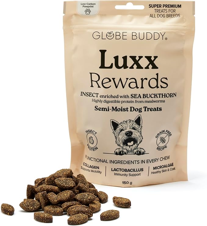 Об этом товаре. Безглютеновый рецепт: наши собачьи бисквиты Globe Buddy Luxx Rewards идеально подходят для собак с непереносимостью зерновых. Высококачественный белок насекомых: наши натуральные собачьи бисквиты содержат высококачественный белок насекомых в сочетании с желтым горошком, тыквой и красной чечевицей для сбалансированного питания. Функциональные ингредиенты: коллаген для поддержки подвижности, лактобактерии для укрепления иммунитета и микроводоросли для здоровой кожи и блестящей шерсти. Обогащены облепихой и юккой для дополнительных питательных веществ. Суперпремиальное качество: наши мягкие и вкусные собачьи лакомства высочайшего качества идеально подходят в качестве лакомства, поощрения или просто для отдыха. Доступны в упаковках по 150 г. Перерабатываемая упаковка: мы заботимся об окружающей среде. Наши собачьи бисквиты выпускаются в повторно закрывающейся и перерабатываемой упаковке, что гарантирует свежесть и экологичность. Сделано в ЕС. › Подробнее о продукте