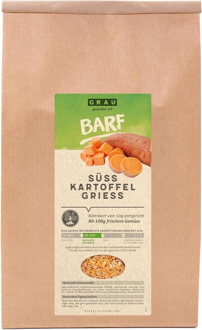 Описание Манная крупа из сладкого картофеля (GRAU) — по-настоящему сытный корм, идеальное дополнение к меню вашего четвероногого друга. Этот продукт BARF лучше всего замачивать в воде. Состав: 100% сладкий картофель. Аналитические ингредиенты: сырой протеин 4,9%, жирность 1,8%, влажность 6,0%. Инструкция по приготовлению Как это работает: замочите порцию наших сухих продуктов BARF в воде до достижения желаемой консистенции, подождите примерно 10-20 минут. После получения желаемой смеси смешайте (сушеные овощи) с нашими банками GRAU или даже с сырым мясом по вашему выбору. Для лучшего качества и сбалансированного питания используйте наши добавки. Полезно знать: 1 г сушеных овощей соответствует примерно 10 г свежих овощей. Ингредиенты 100% сладкий картофель Инструкция по приготовлению Как это работает: замочите порцию наших сухих продуктов BARF в воде до достижения желаемой консистенции, подождите примерно 10-20 минут. Получив желаемую смесь, смешайте сушеные овощи с нашими консервами GRAU или даже с сырым мясом по вашему выбору. Для более качественного и сбалансированного питания используйте наши добавки. Полезно знать: 1 г сушеных овощей эквивалентен примерно 10 г свежих. После замачивания в воде получается приятная, нежная каша, которую приятно есть. Подробнее