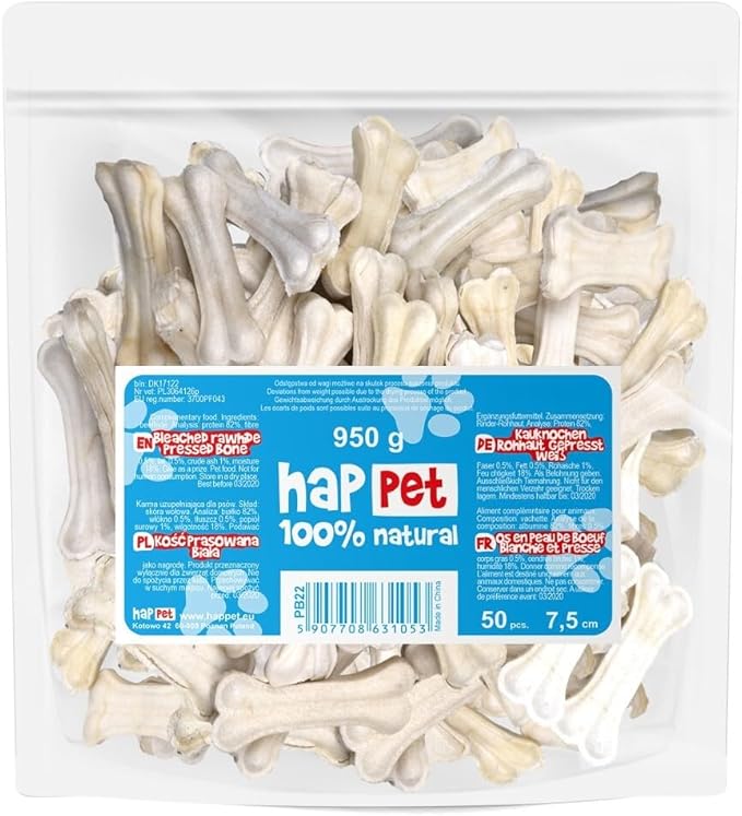 Описание продукта: Белая прессованная кость 7,5 см (50 штук) Для собак. Косточки Happet изготовлены из специальной массы, приготовленной из предварительно вываренной коровьей кожи, которая затем высушивается и прессуется в форму настоящей кости. Благодаря этим процессам лакомство получается приятно твердым, не портится, не имеет запаха и вкуса. Это прекрасная игрушка, которая займет вашу собаку на несколько часов, а также вкусное лакомство. Продукт полностью безопасен, не содержит искусственных отдушек, консервантов и красителей и на 100% усваивается. Натуральная кость — отличная игрушка и полезная награда во время дрессировки. Косточка — это не только идеальная игрушка, но и лакомство для собаки, поэтому ее можно использовать в качестве награды. Удовлетворяет чрезвычайно важную потребность жевать и кусать. Занимает вашу собаку дольше. Естественным образом очищает зубы наших питомцев. Предотвращает образование зубного камня. Массирует десны. Отличается высоким содержанием белка и низким содержанием жира. Идеально подходит для любой собаки, даже для тех, у кого проблемы с весом. Устраняет бактериальное скопление на зубах питомцев, которое может вызывать неприятный запах изо рта и заболевания пародонта. Жевание этих жевательных палочек снимает напряжение и облегчает все симптомы стресса у собак. Можно давать между приемами пищи. Нет неприятного запаха, как у сырых костей. Длина: 7,5 см. Упаковка: 950 г, 50 штук. Состав: говяжья шкура. Анализ: белок 82%, клетчатка 0,5%, жир 0,5%, сырая зола 1%, влажность 18%. Помните! Лакомства для собак не заменяют основные продукты питания. Хотя они и обеспечивают некоторые питательные вещества, они просто приятное дополнение к ежедневному рациону вашего питомца. Не давайте щенкам младше 3 месяцев. Инструкция по применению: без искусственных ароматизаторов, красителей и консервантов. Состав: коровья шкура. Инструкция по применению: Эти лакомства не заменяют основные продукты питания. Хотя они и обеспечивают некоторые питательные вещества, они просто приятное дополнение к ежедневному рациону вашего питомца. Не давать котятам младше 3 месяцев. Подробнее