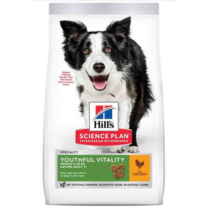 Hill’s Science Plan Canine Mature Adult 7+ Senior Vitality — это корм для собак среднего размера, который помогает вашей собаке чувствовать себя моложе, борясь с признаками старения.