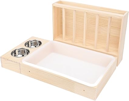 [Глубокие миски для чистого кормления] Этот лоток для кроликов оснащен двумя глубокими мисками из нержавеющей стали, которые не только вмещают больше корма и воды, но и предотвращают пролитие. Конструкция гарантирует, что кролики не будут проливать корм или воду повсюду, сохраняя место кормления чистым и гигиеничным дольше. [Просторный и универсальный дизайн] Наш деревянный туалет с кормушкой достаточно просторен, чтобы несколько кроликов могли одновременно наслаждаться сеном. Подходит для различных травоядных животных, включая хомяков и шиншилл, этот продукт создает чистую и комфортную среду обитания для ваших маленьких питомцев.