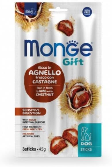 Информация Monge Dog Snack Monge Gift stick Monge Lamb taste with Chestnuts Monge Sensitive Digestion Monge 3×135 gr ›