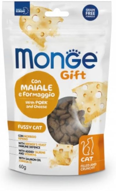 Описание продукта: Monge Gift Cat для привередливых кошек со свининой и сыром – это дополнительный корм для взрослых кошек. Специально разработан для благополучия вашей кошки, с хрустящей корочкой для поддержания гигиены полости рта и мягкой сырной начинкой, которая стимулирует даже самых привередливых едоков. Формула без зерновых, со свининой для оптимальной вкусовой привлекательности и усвояемости. Формула обогащена таурином для поддержания зрения и нормальной работы сердца, а также витаминами для ежедневной энергии. Включение функциональных ингредиентов, таких как пивные дрожжи для укрепления иммунитета и лососевое масло – источник омега-3 жирных кислот, – является результатом исследований, проведенных в Италии. Не содержит искусственных консервантов и добавленного сахара. Показания: Помогает при дрессировке. Хранить в прохладном, сухом месте вдали от источников тепла. Состав: Свинина