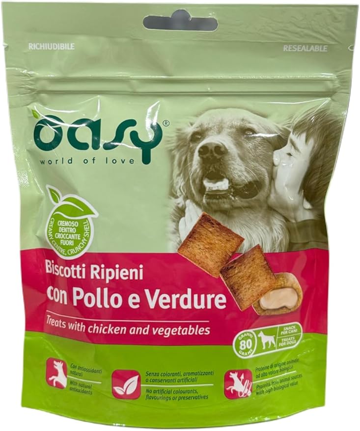 Описание продукта: Печенье Oasy Snacks с начинкой для взрослых собак, со вкусом курицы и овощей. Хрустящее печенье с кремовой начинкой, обогащенное витаминами, кальцием и минералами для здорового роста: идеальное лакомство, которое порадует вашего щенка в любой ситуации. Способ применения: Помогает в дрессировке. Хранить в прохладном, сухом месте, вдали от источников тепла. Ингредиенты: Курица