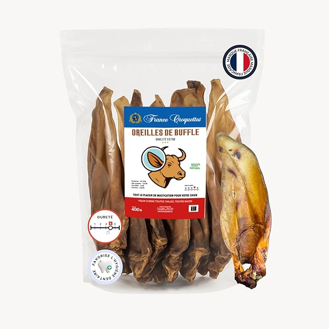 100% натуральный и высушенный вручную — ПРЕМИАЛЬНОЕ КАЧЕСТВО Наши буйволиные уши тщательно отбираются вручную, затем медленно высушиваются для сохранения их текстуры, вкуса и питательных свойств. Они не содержат добавок, консервантов и красителей, поставляются из короткой цепочки поставок, что гарантирует исключительное качество и подходят для всех собак, независимо от размера и породы. ✓ Богаты защитой (87,59%) — ИДЕАЛЬНО ДЛЯ ЖИЗНЕННОЙ СИЛЫ Благодаря чрезвычайно высокому содержанию белка эти лакомства поддерживают мышечную массу вашей собаки, ее восстановление и энергию на протяжении всей ее повседневной жизни. С низким содержанием жира (3,23%) они также подходят для диетических или неактивных собак. Сбалансированный, здоровый и ультрапитательный перекус в любое время дня. ️ ОЧЕНЬ ДЛИТЕЛЬНОЕ ЖЕВАНИЕ — ЗАНЯТО И ГЛУБОКОЕ УСПОКАИВАНИЕ. Благодаря плотной, упругой и прочной текстуре эти уши обеспечивают интенсивную и длительную жевательную активность, эффективно занимая вашу собаку, снижая беспокойство, направляя ее энергию в нужное русло и ограничивая деструктивное поведение, связанное со скукой или стрессом. Идеально подходит для того, чтобы занять собаку, пока вас нет. НАТУРАЛЬНАЯ ГИГИЕНА ПОЛОСТИ РТА — ЭФФЕКТИВНОЕ МЕХАНИЧЕСКОЕ ВОЗДЕЙСТВИЕ. Постоянное трение о зубы во время жевания помогает уменьшить зубной налет, предотвратить образование зубного камня и укрепить десны. Простой ежедневный жест для поддержания здоровья, способствующий улучшению гигиены полости рта и свежести дыхания без добавления химических веществ. ОПТИМАЛЬНАЯ ХРАНИМОСТЬ — Длительная свежесть и хрусткость благодаря чрезвычайно низкому уровню влажности (3,65%) и контролируемому уровню золы (0,65%), наши буйволиные уши долго сохраняются, не теряя своей текстуры и вкусовых качеств. Это натуральный, безопасный и натуральный продукт, который легко хранить, перевозить и предлагать в качестве поощрения или лакомства по любому поводу. › Подробнее о товаре