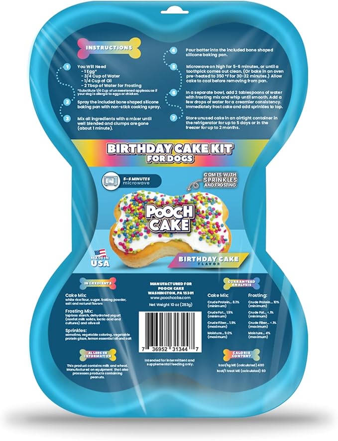 Описание продукта Идеальный способ отпраздновать особый день вашего щенка взрывом вкуса и веселья! Этот набор содержит восхитительный вкус праздничного торта с разноцветной посыпкой, что обеспечит праздничный штрих на дне рождения вашей собаки. Сделанный из полностью натуральных ингредиентов, этот состав для торта — полезный выбор для вашего пушистого друга. Кроме того, его легко приготовить, что делает его удобным для любой вечеринки в честь дня рождения собаки. Покажите своему щенку свою любовь, угостив его этим полезным и вкусным тортом в его большой день. Сделайте день рождения вашей собаки незабываемым праздником, полным радости и вкусных угощений! Состав смеси для торта: рисовая мука, коричневый сахар, разрыхлитель, соль и натуральные ароматизаторы Инструкции: Смажьте прилагаемую силиконовую форму для торта в форме косточки антипригарным спреем. Смешайте все ингредиенты миксером до однородной массы без комков (около 1 минуты). Вылейте тесто в прилагаемую силиконовую форму для торта в форме косточки. Готовьте в микроволновой печи на высокой мощности в течение 5-6 минут или до тех пор, пока зубочистка не будет выходить чистой. (Или выпекайте в предварительно разогретой духовке при температуре 175°C (350°F) в течение 30–32 минут.) Дайте торту остыть, прежде чем вынимать его из формы. В отдельной миске добавьте 2 столовые ложки воды к глазури и взбейте до однородной массы. Добавьте несколько капель воды для более кремообразной консистенции. Сразу же покройте торт глазурью и посыпьте сверху посыпкой. 7. Храните неиспользованный торт в герметичном контейнере в холодильнике до 5 дней или в морозильной камере до 2 месяцев. Подробнее