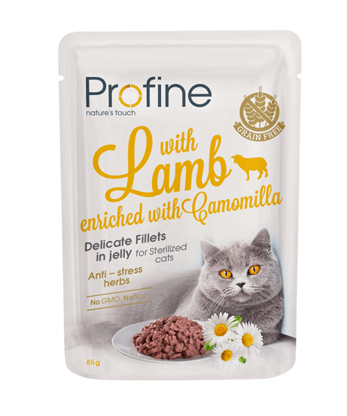 Кусочки филе с ягненком, обогащенные ромашкой. Без зерновых суперпремий для стерилизованных кошек.