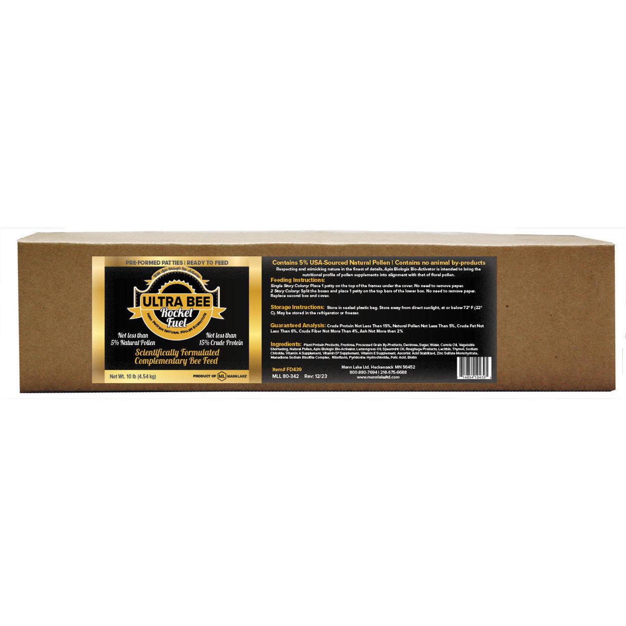 Ultra Bee Rocket Fuel Patties™ изготавливаются только из растительных ингредиентов и натуральной облученной пыльцы из США. Это гарантирует, что ваши пчелы получат сбалансированный рацион полезных витаминов, липидов, минералов и полный профиль аминокислот. Сделано в США.